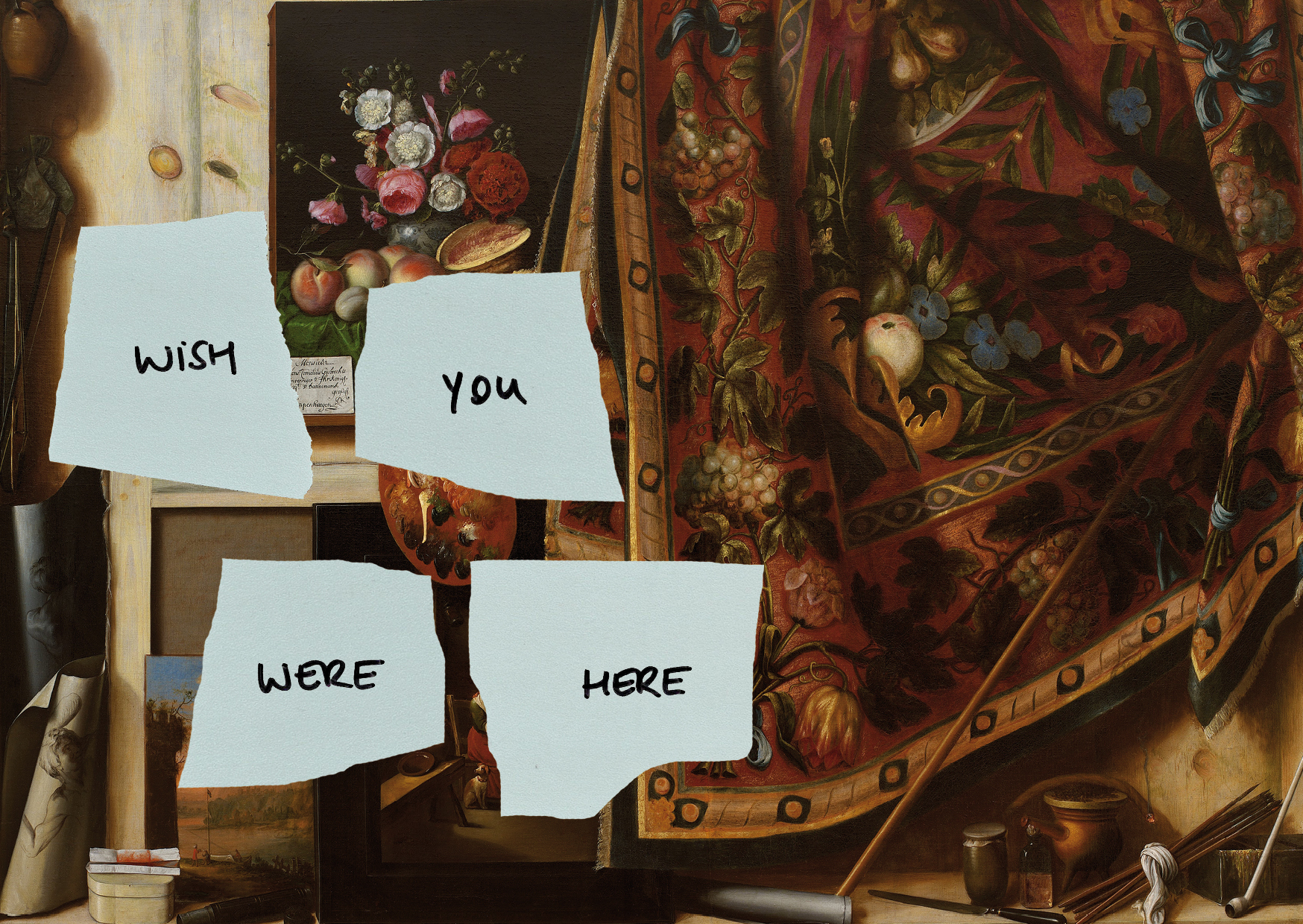 Die Galerie ist gleichzeitig Ausstellungsraum und Atelier der drei Künstlerinnen auf Durchreise. WISH YOU WERE HERE verändert sich aufgrund seines partizipativen Charakters über den gesamten Ausstellungszeitraum hinweg. Anlässlich der Finissage ist WISH YOU WERE HERE dann in seiner endgültigen Fassung zu sehen.