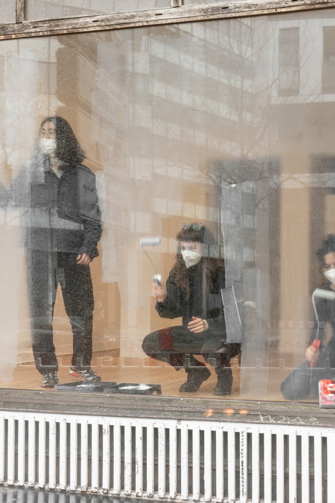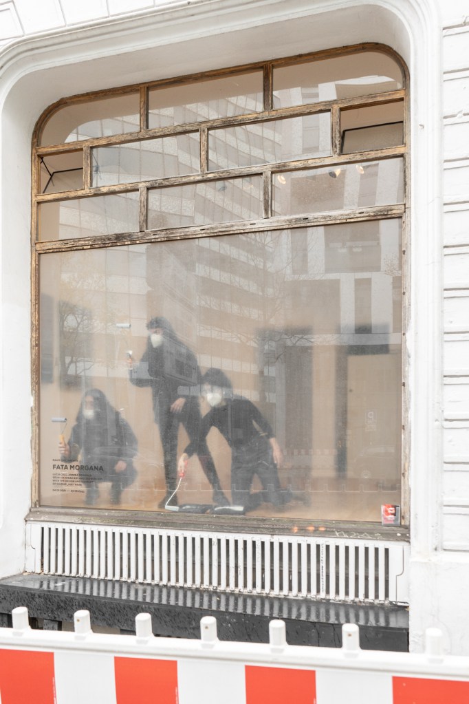 From the exterior, (outer room) the two screens of these two rooms are being covered. There is a paradoxical attempt to bring a serene and milky landscape to the busy and empty street. And it suggests the boring novelty of the city: the expectation of an encounter with a utopia, the never seen interior of a building.