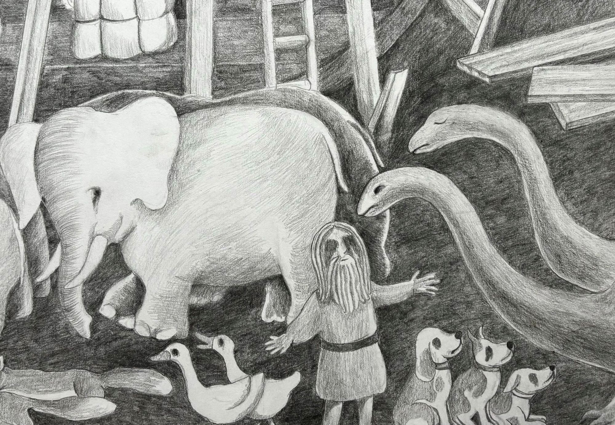 In Cerberus Arche (Bleistift auf Papier, 2023) nimmt Sonja ausgehend von einem Ravensburger Kinderpuzzle Bezug auf die kreationistische Theorie, wonach die Dinosaurier zusammen mit Menschen vor der Flut gelebt haben. Die Dinos haben es nicht auf die Arche geschafft – es gab nie eine vernünftige Erklärung dazu, dafür abertausende von gebrochenen Kinderherzen. In weiteren Zeichnungen entwirft sie eine persönliche Perspektive auf ihren Glauben, den sie als Kind und junge Erwachsene gelebt hat.